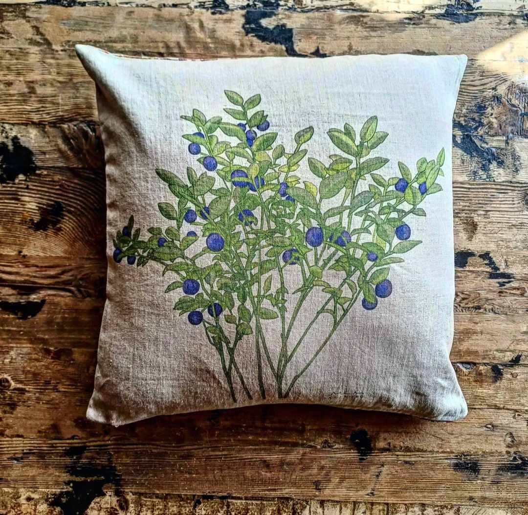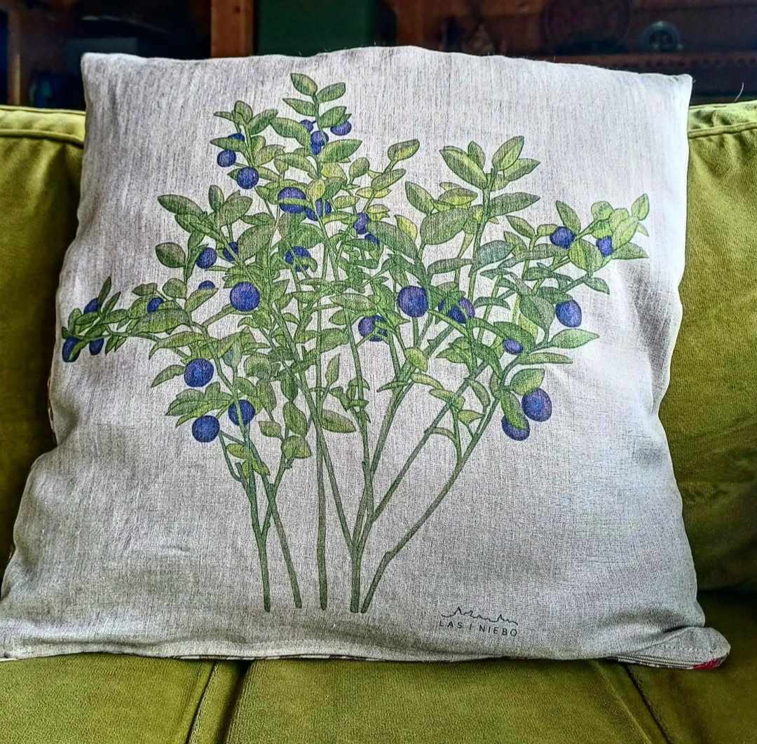 Dwustronna poszewka na poduszkę z nadrukiem autorskiego rysunku jagód z jednej strony i motywem różnych owoców leśnych z drugiej.