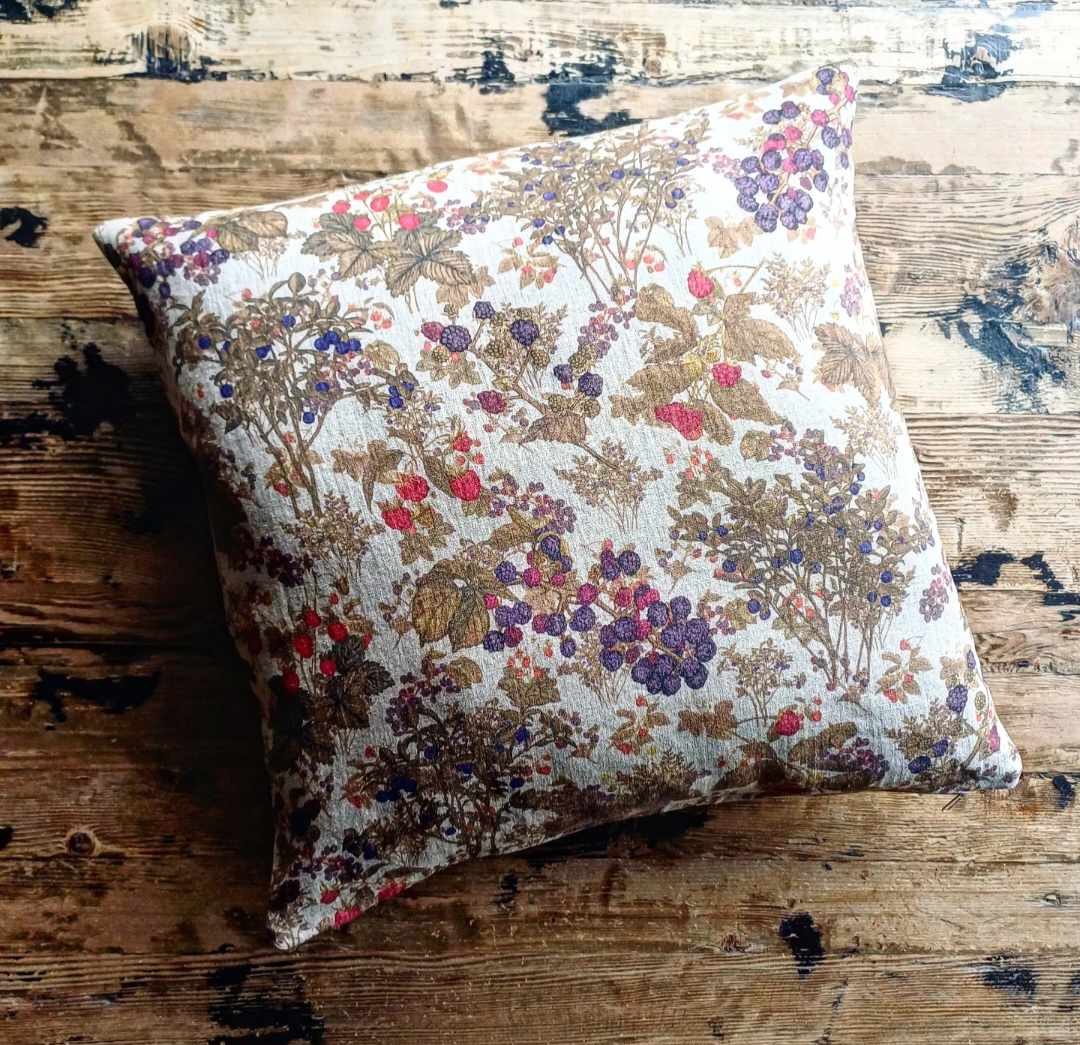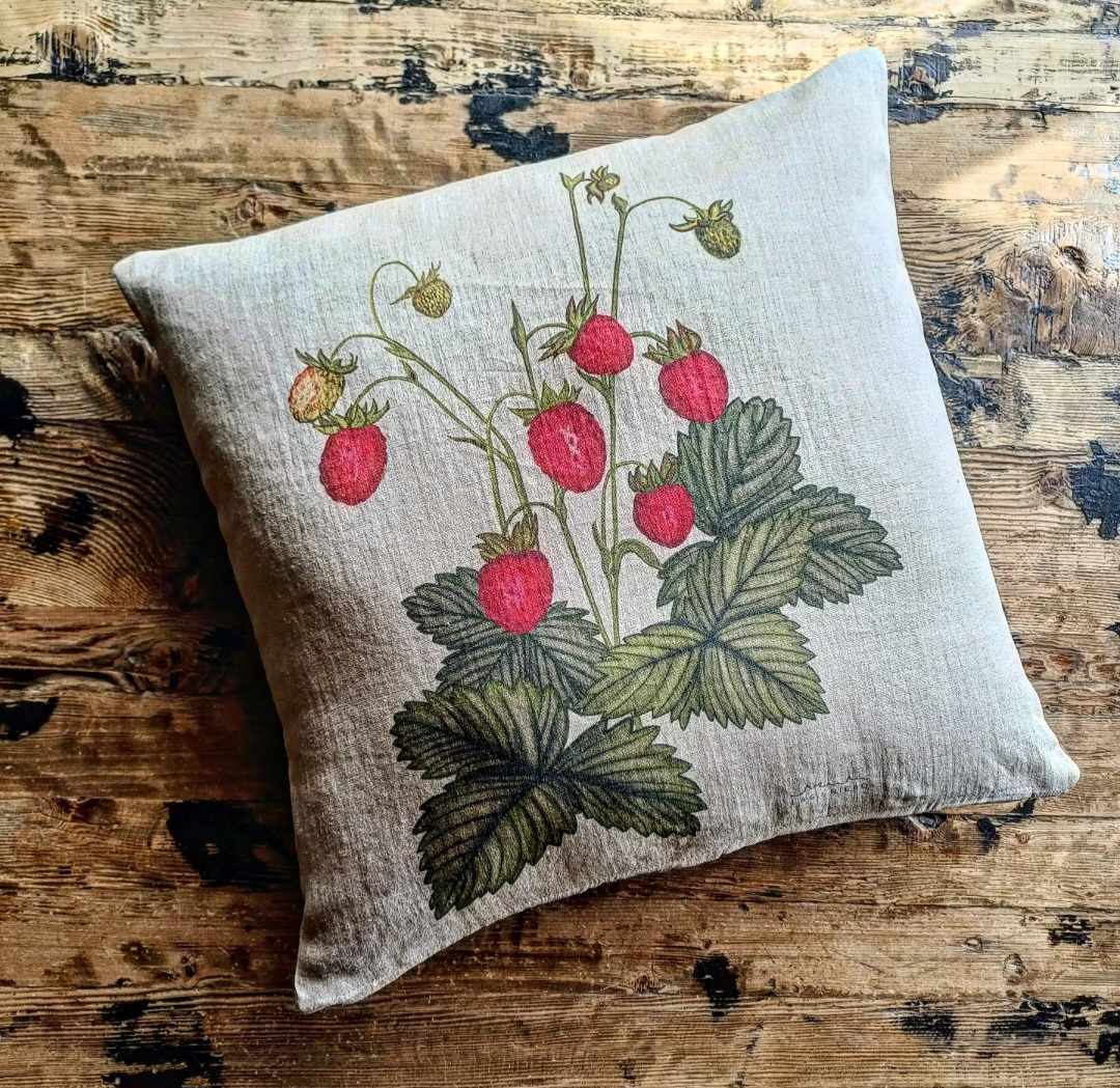 Dwustronna poszewka na poduszkę z nadrukiem autorskiego rysunku poziomek z jednej strony i motywem różnych owoców leśnych z drugiej.