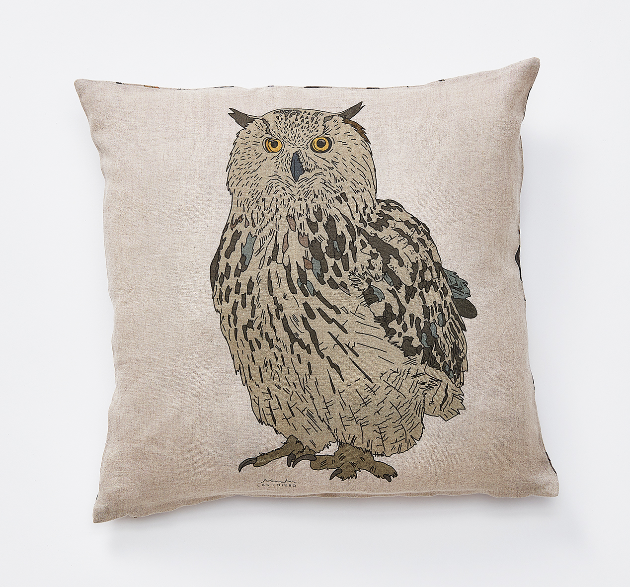 Dwustronna poszewka na poduszkę z nadrukiem autorskiego rysunku Puchacza z jednej strony i motywem różnych ptaków z drugiej.