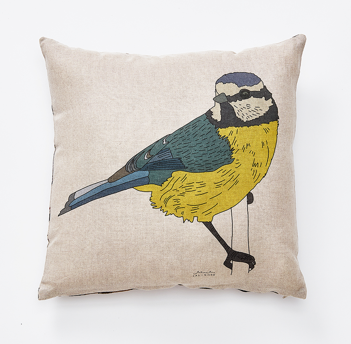 Dwustronna poszewka na poduszkę z nadrukiem autorskiego rysunku Sikorki z jednej strony i motywem różnych ptaków z drugiej.