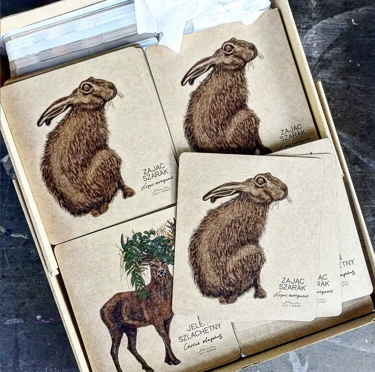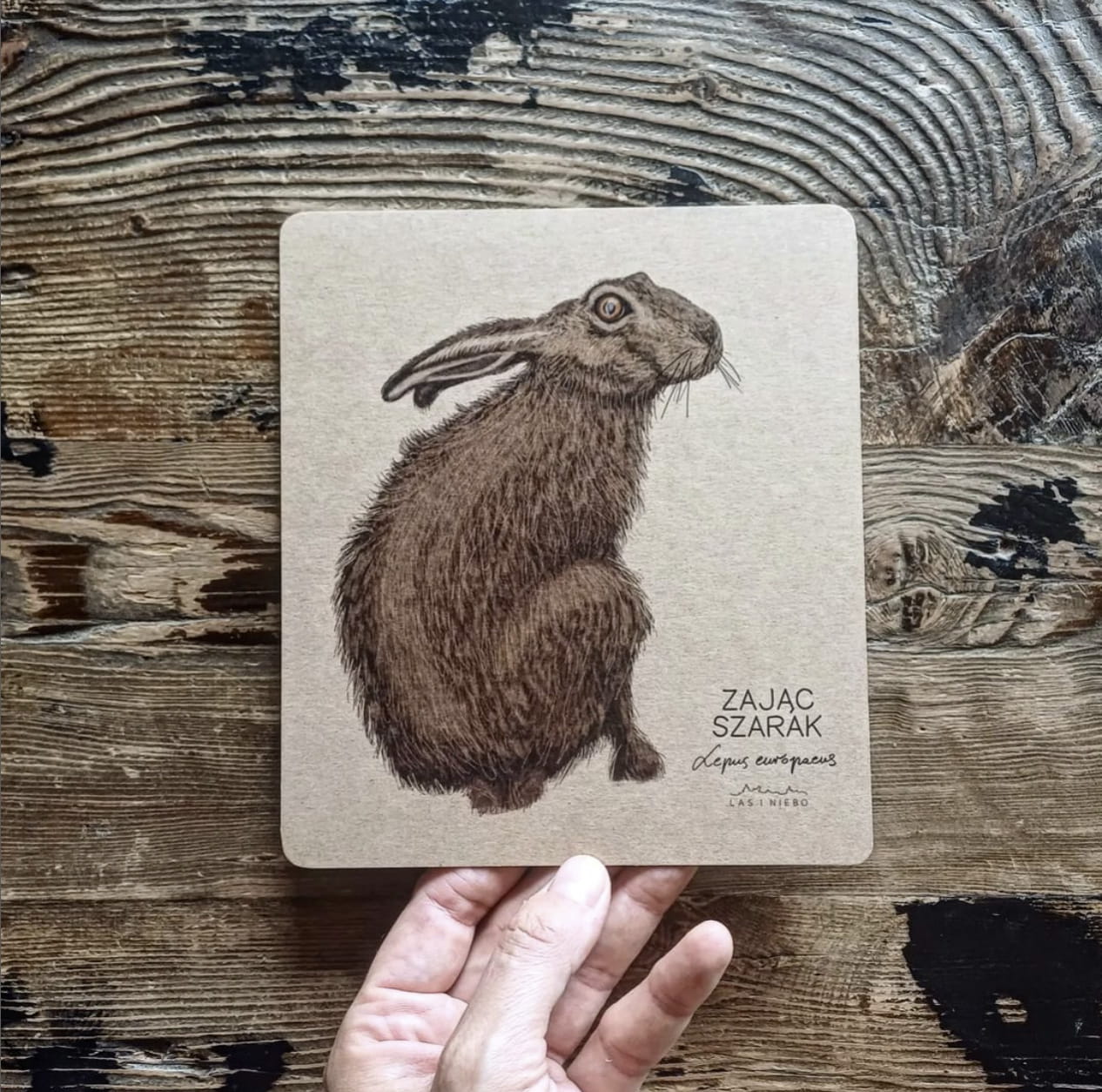 Karta dekoracyjna z wydrukiem autorskiego rysunku Zająca szaraka (Lepus europaeus).